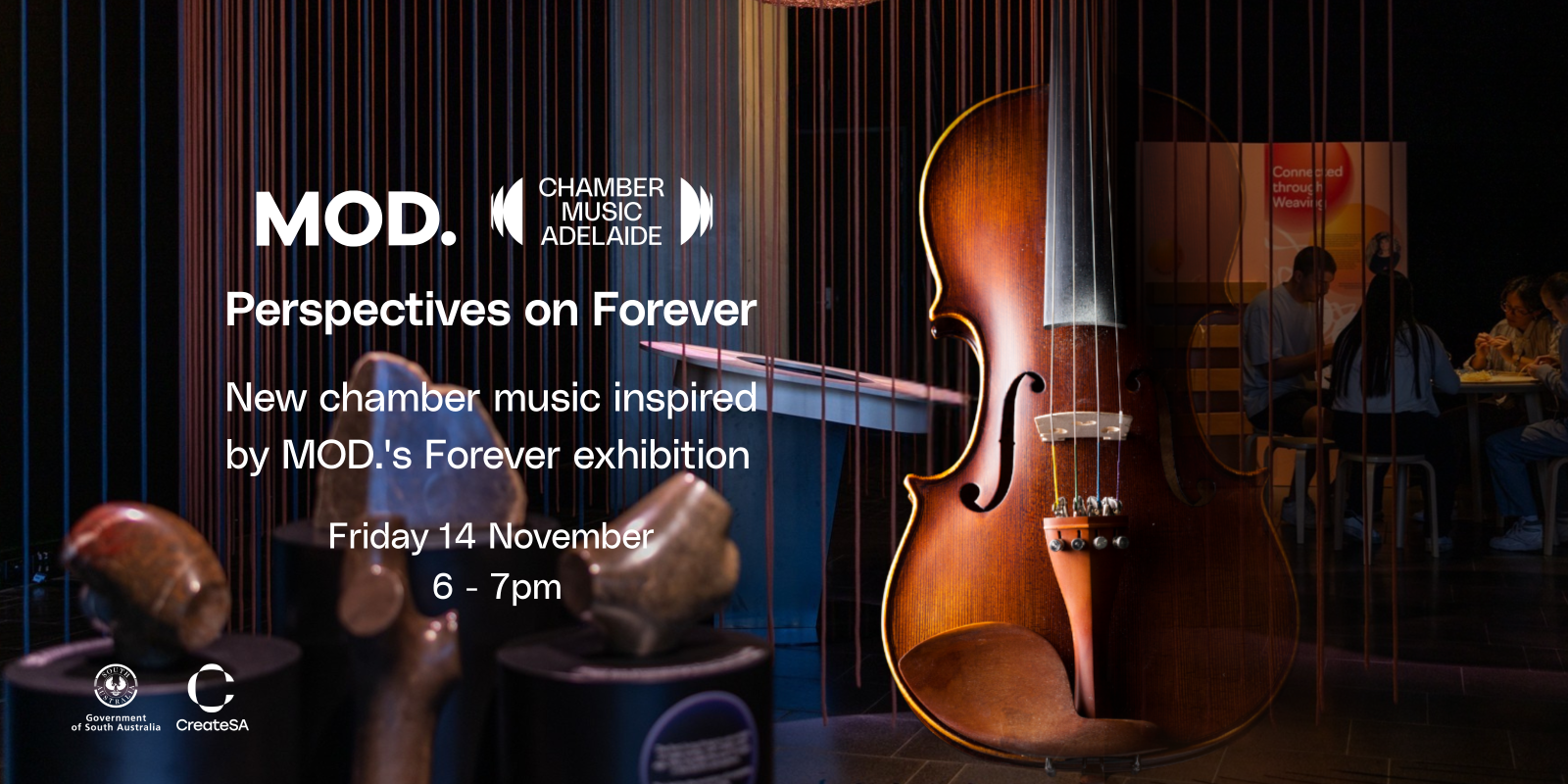 Two stunning new chamber works premiere within MOD.’s Forever exhibition, where composers have worked alongside museum researchers to explore themes of time, memory, and transformation through music. Commissioned by Chamber Music Adelaide in partnership with MOD. and supported by Create SA.